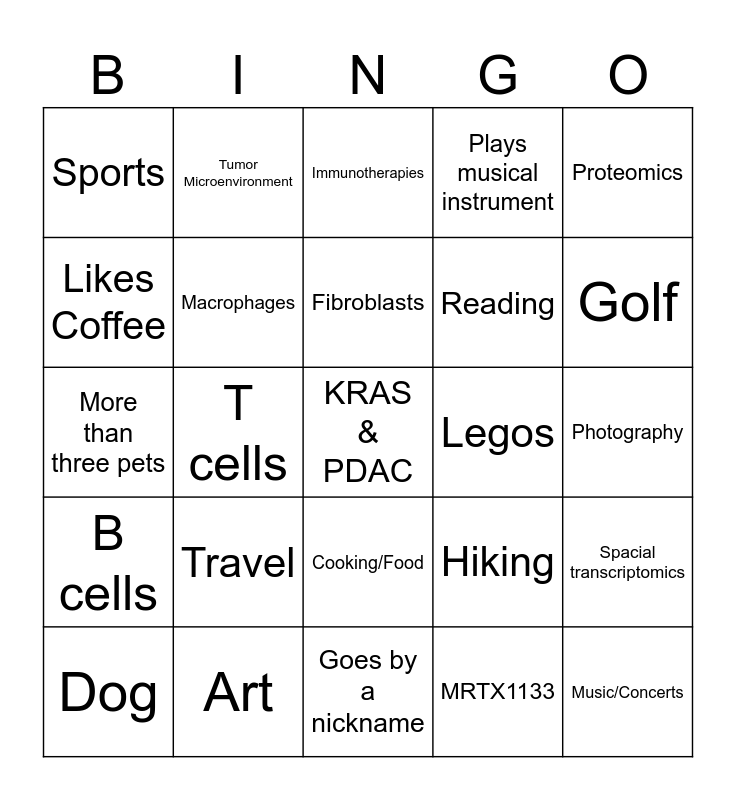 This bingo card has a free space and 32 words: MRTX1133, RM-42, T cells, NK cells, B cells, Macrophages, Proteomics, Spacial transcriptomics, Tumor Microenvironment, Metabolism, Fibroblasts, Immunotherapies, Clinical Trial, Snow Sports, Legos, Cat, Dog, More than three pets, Cooking/Food, Travel, Hiking, Yoga, Photography, Art, Music/Concerts, Plays musical instrument, Reading, Likes Coffee, Sports, Goes by a nickname, Tennis and Golf.