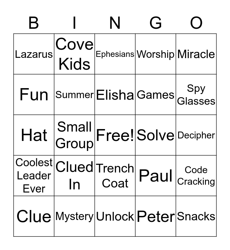 This bingo card has a free space and 24 words: Clued In, Mystery, Elisha, Clue, Miracle, Lazarus, Fun, Cove Kids, Solve, Trench Coat, Games, Hat, Paul, Code Cracking, Summer, Peter, Decipher, Ephesians, Spy Glasses, Small Group, Snacks, Coolest Leader Ever, Worship and Unlock.