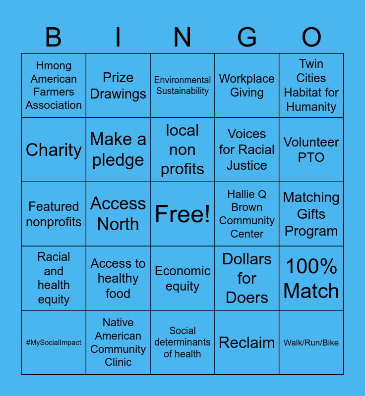 This bingo card has a free space and 29 words: #MySocialImpact, Report to the Community, Access North, Everyday Miracles, Hmong American Farmers Association, Environmental Sustainability, Make a pledge, Access to healthy food, Hallie Q Brown Community Center, Native American Community Clinic, Matching Gifts Program, Walk/Run/Bike, Social determinants of health, Reclaim, Volunteer PTO, Minnesota FoodShare, Economic equity, Racial and health equity, Twin Cities Habitat for Humanity, Featured nonprofits, Dollars for Doers, Community, Voices for Racial Justice, Charity, Workplace Giving, Prize Drawings, 100% Match, local non profits and Participation rates.