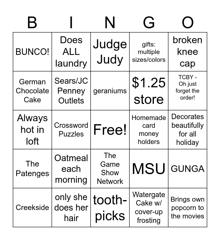 This bingo card has a free space and 24 words: Oatmeal each morning, only she does her hair, geraniums, Creekside, broken knee cap, BUNCO!, German Chocolate Cake, Does ALL laundry, Homemade card money holders, The Game Show Network, $1.25 store, Always hot in loft, MSU, GUNGA, Sears/JC Penney Outlets, Watergate Cake w/ cover-up frosting, Decorates beautifully for all holiday, Judge Judy, TCBY - Oh just forget the order!, Crossword Puzzles, Brings own popcorn to the movies, The Patenges, gifts: multiple sizes/colors and tooth-picks.