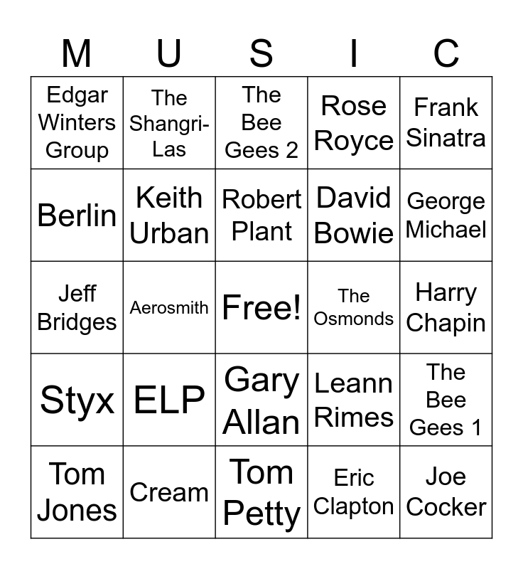 This bingo card has a free space and 64 words: Stevie Nicks, Cheap Trick, The Eagles, The Bee Gees 1, Nazareth, Mason Williams, The Shangri-Las, Diana Ross, Robert Plant, Mary Chapin Carpenter, Gary Allan, Fleetwood Mac, Harry Chapin, Frank Sinatra, Gary Puckett, Berlin, Aerosmith, Edgar Winters Group, Joan Jett, David Bowie, ELP, Styx, Rose Royce, We Five, Jimmy Buffett, Elton John, Queen, Sugarland, Sara Evans, Rick Derringer, Jackson Browne, Journey, Herbie Hancock, Pat Benatar, George Michael, Tom Jones, Barry Manilow, Eric Clapton, John Denver, Keith Urban, Jeff Bridges, The Osmonds, Johnny Cash, Mary Hopkin, Rosemary Clooney, Joe Cocker, Cream, Bob Seger, Leann Rimes, George Jones, The Blues Brothers, Dire Straits, Tom Petty, Kim Carnes, The Waitresses, Walker Hayes, The Bee Gees 2, George Strait, The Yardbirds, Manfred Mann, 38 Special, Guns n Roses, Jim Croce and Brewer & Shipley.