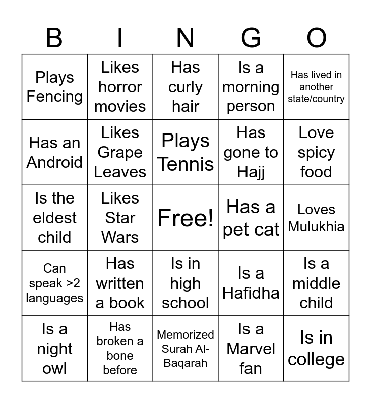 This bingo card has a free space and 27 words: Is a Hafidha, Has gone to Umrah, Has gone to Hajj, Memorized Surah Al-Baqarah, Has an Android, Has curly hair, Likes horror movies, Can speak >2 languages, Has a pet cat, Is a middle child, Is the eldest child, Is a morning person, Is a night owl, Has broken a bone before, Love spicy food, Can't eat spicy food, Likes Grape Leaves, Plays Tennis, Has written a book, Plays Fencing, Loves Mulukhia, Is a Marvel fan, Likes Star Wars, Is in college, Is in high school, Has lived in another state/country and Likes Mushrooms on Pizza.