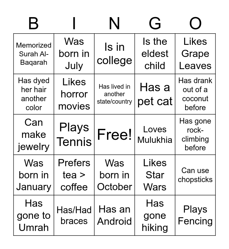 This bingo card has a free space and 56 words: Is a Hafidha, Has gone to Umrah, Has gone to Hajj, Memorized Surah Al-Baqarah, Has an Android, Has curly hair, Likes horror movies, Can speak >2 languages, Has a pet cat, Is a middle child, Is the eldest child, Is a morning person, Is a night owl, Has broken a bone before, Love spicy food, Can't eat spicy food, Likes Grape Leaves, Plays Tennis, Has written a book, Plays Fencing, Loves Mulukhia, Is a Marvel fan, Likes Star Wars, Is in college, Is in high school, Has lived in another state/country, Likes Mushrooms on Pizza, Likes Pineapple on Pizza, Has drank out of a coconut before, Has a pet bird, Has freckles, Isn't afraid of spiders, Is left-handed, Has gone scuba diving, Has gone rock-climbing before, Has dyed her hair another color, Can make jewelry, Can make embroidery, Was born in January, Was born in July, Was born in October, Was born in March, Doesn't like chocolate, Can do a cartwheel, Favorite chips flavor: Salt and Vinegar, Prefers tea > coffee, Has/Had braces, Is scared of contact lenses, Plays Archery, Is a Runner, Has gone hiking, Wore hijab at a young age, Wore hijab at an older age, Knows how to juggle, Can use chopsticks and Loves to bake.