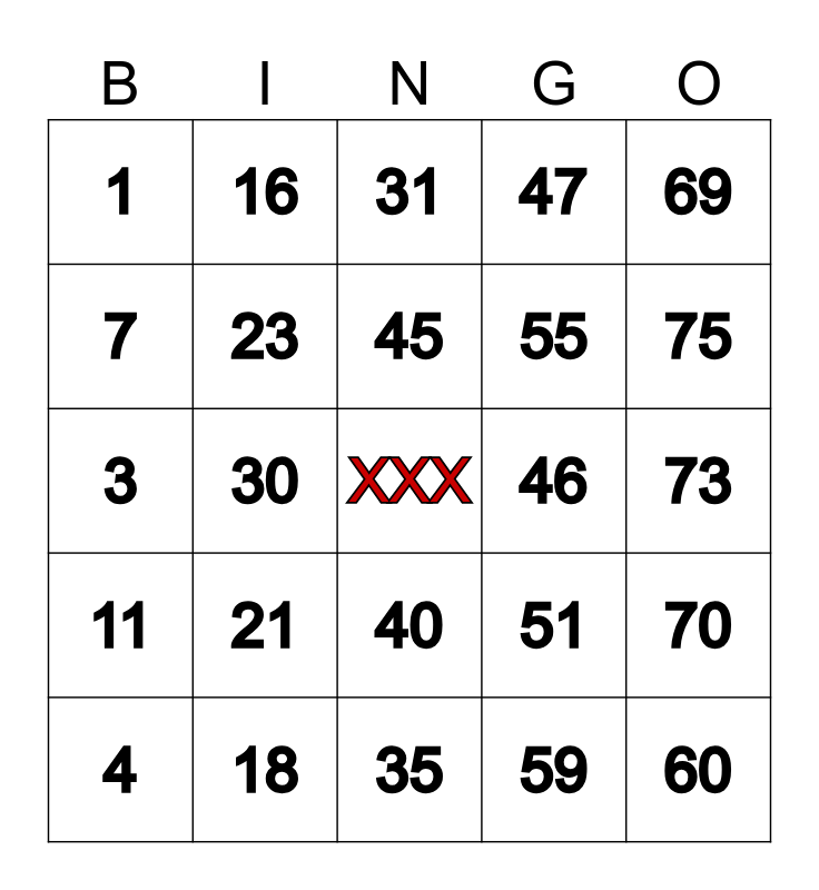 This bingo card has a free space and 24 words: 4, 21, 45, 59, 69, 1, 16, 31, 46, 73, 3, 23, 51, 70, 7, 18, 35, 47, 75, 11, 30, 40, 55 and 60.