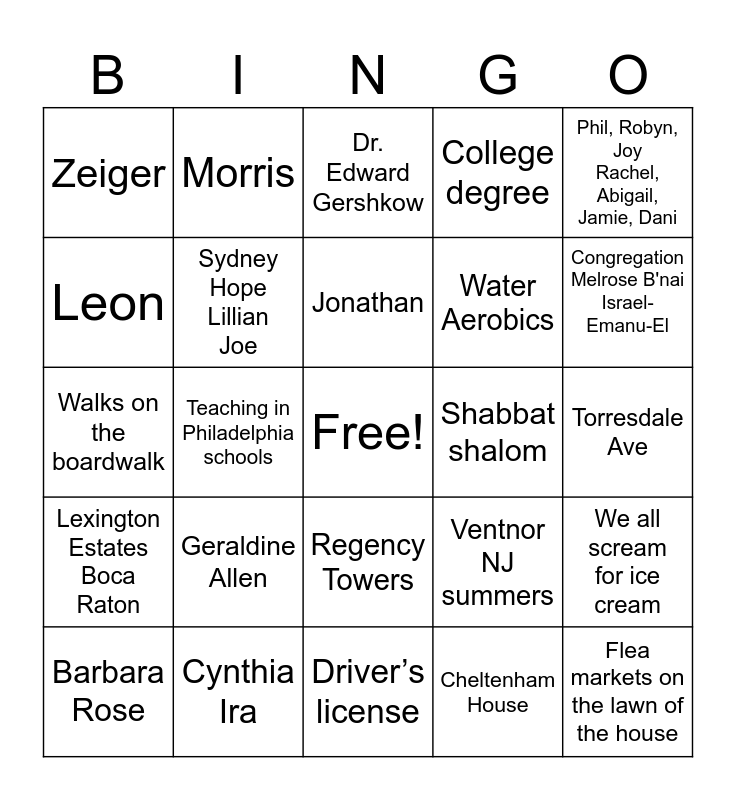 This bingo card has a free space and 24 words: Geraldine Allen, Cynthia Ira, Jonathan, Barbara Rose, Phil, Robyn, Joy Rachel, Abigail, Jamie, Dani, Zeiger, Leon, Morris, Shabbat shalom, Regency Towers, Water Aerobics, Walks on the boardwalk, Ventnor NJ summers, We all scream for ice cream, Sydney Hope Lillian Joe, Cheltenham House, Torresdale Ave, Dr. Edward Gershkow, Congregation Melrose B'nai Israel-Emanu-El, Teaching in Philadelphia schools, Flea markets on the lawn of the house, Lexington Estates Boca Raton, College degree and Driver’s license.