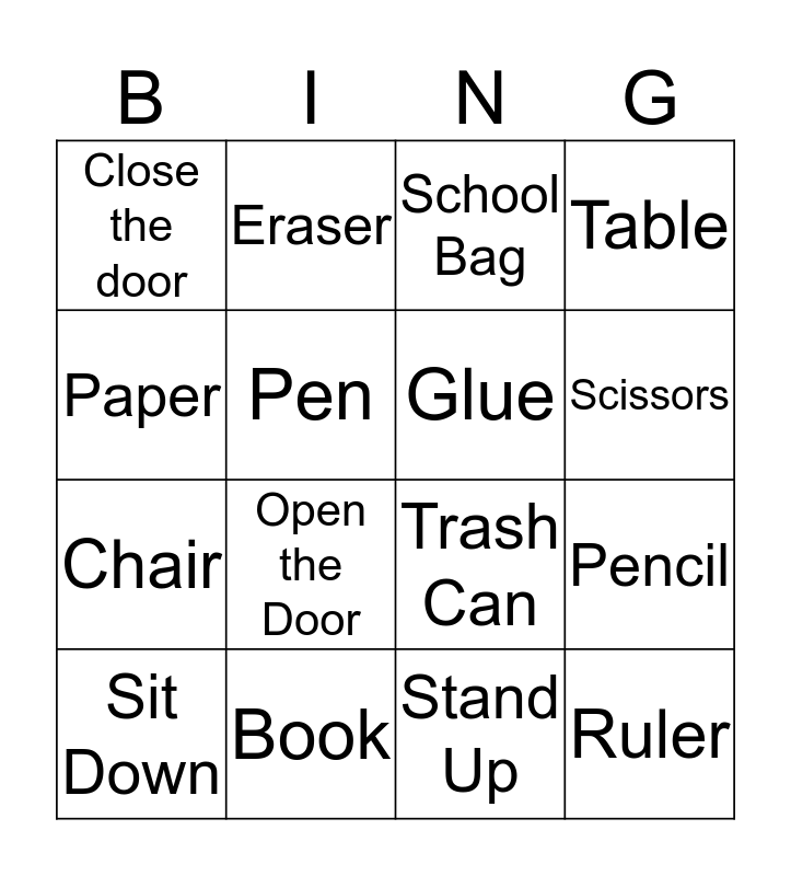 This bingo card has a free space and 15 words: Sit Down, Ruler, School Bag, Close the door, Scissors, Paper, Open the Door, Stand Up, Pen, Chair, Pencil, Table, Glue, Eraser and Book.