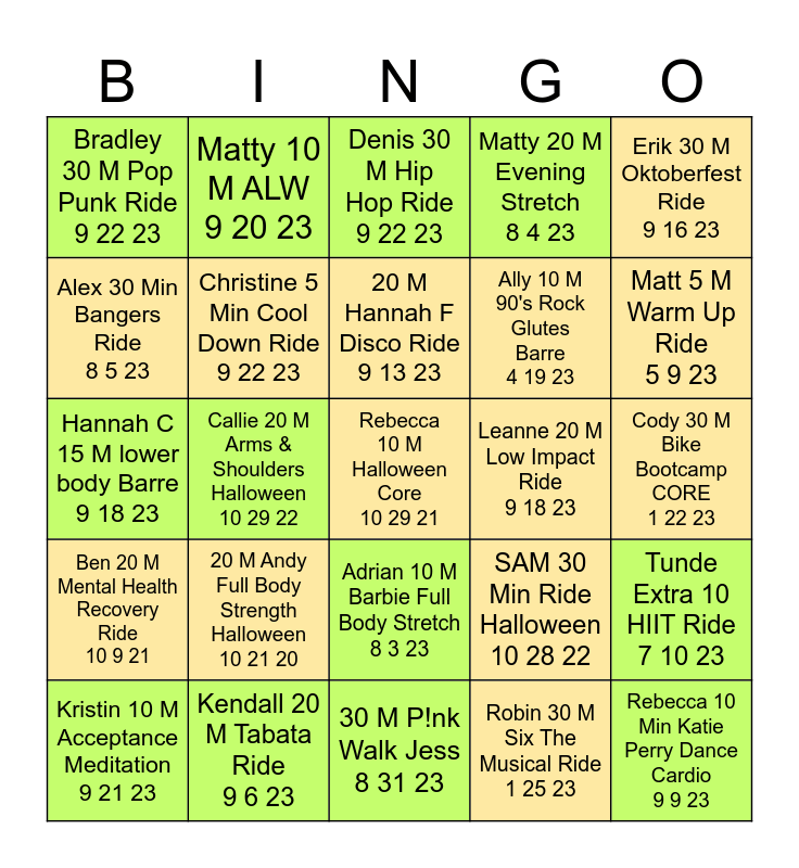 This bingo card has 25 words: 20 M Andy Full Body Strength Halloween 10 21 20, 30 M P!nk Walk Jess 8 31 23, 20 M Hannah F Disco Ride 9 13 23, Kristin 10 M Acceptance Meditation 9 21 23, Erik 30 M Oktoberfest Ride 9 16 23, Bradley 30 M Pop Punk Ride 9 22 23, Alex 30 Min Bangers Ride 8 5 23, Matty 10 M ALW 9 20 23, Leanne 20 M Low Impact Ride 9 18 23, Adrian 10 M Barbie Full Body Stretch 8 3 23, Ally 10 M 90's Rock Glutes Barre 4 19 23, Hannah C 15 M lower body Barre 9 18 23, SAM 30 Min Ride Halloween 10 28 22, Tunde Extra 10 HIIT Ride 7 10 23, Christine 5 Min Cool Down Ride 9 22 23, Rebecca 10 Min Katie Perry Dance Cardio 9 9 23, Cody 30 M Bike Bootcamp CORE 1 22 23, Denis 30 M Hip Hop Ride 9 22 23, Matt 5 M Warm Up Ride 5 9 23, Callie 20 M Arms & Shoulders Halloween 10 29 22, Rebecca 10 M Halloween Core 10 29 21, Kendall 20 M Tabata Ride 9 6 23, Ben 20 M Mental Health Recovery Ride 10 9 21, Matty 20 M Evening Stretch 8 4 23 and Robin 30 M Six The Musical Ride 1 25 23.
