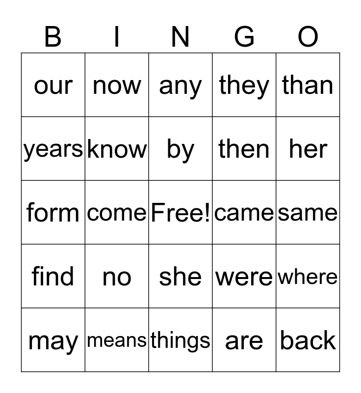 This bingo card has a free space and 24 words: no, means, by, may, than, our, years, now, came, she, then, form, were, where, know, are, same, any, her, come, back, find, they and things.