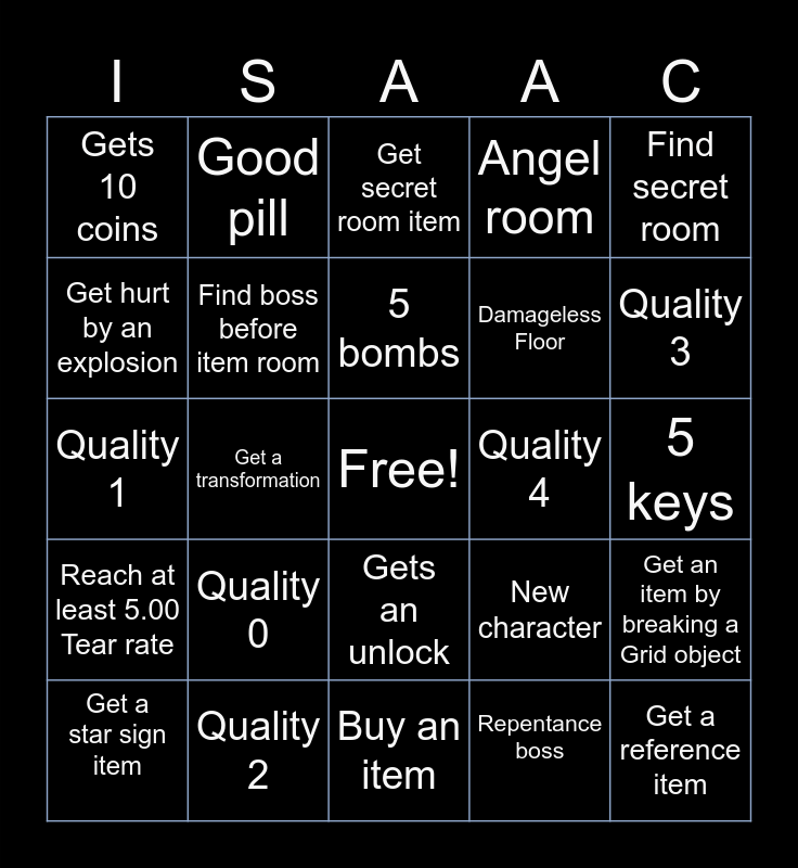 This bingo card has a free space and 34 words: Find an arcade, Repentance boss, Framiliar Item (Follows you), Orbital, Reach at least 5.00 Tear rate, Find boss before item room, Find secret room, Get a star sign item, Good pill, Bad pill, 5 bombs, Get secret room item, No Damage Boss, Say curse word, Quality 4, Quality 3, Quality 2, Quality 1, Quality 0, New character, Gets an unlock, Death, Gets 10 coins, 5 keys, Buy an item, Get a reference item, Angel room, Devil room, Damageless Floor, Get hurt by an explosion, Max hearts (Including soul hearts), Get a transformation, Get an item by breaking a Grid object and 3 champions.