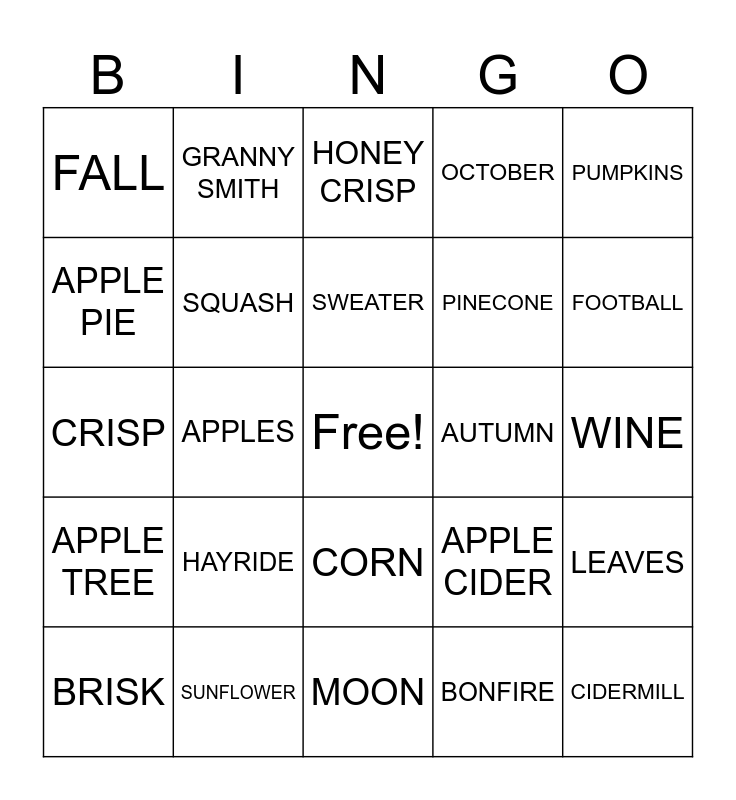 This bingo card has a free space and 28 words: LEAVES, SEPTEMBER, PINECONE, BONFIRE, APPLE PIE, HONEY CRISP, GRANNY SMITH, APPLE TREE, AUTUMN, BRISK, CRISP, OCTOBER, SUNFLOWER, MOON, FOOTBALL, SSCARECROW, HAYRIDE, SQUASH, SWEATER, CORN, FALL, LEAVES, CIDERMILL, APPLES, WINE, APPLE CIDER, PUMPKINS and UPNORTH.