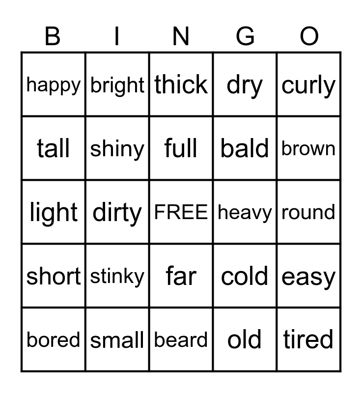 This bingo card has a free space and 24 words: stinky, small, full, bored, curly, happy, tall, bright, heavy, far, bald, light, cold, easy, shiny, old, round, thick, brown, dirty, tired, short, dry and beard.