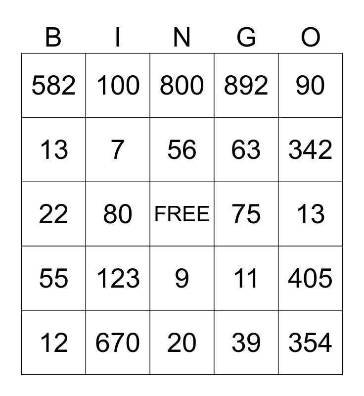 This bingo card has a free space and 24 words: 123, 670, 56, 12, 90, 582, 13, 100, 75, 9, 63, 22, 11, 405, 7, 39, 13, 800, 342, 80, 354, 55, 892 and 20.
