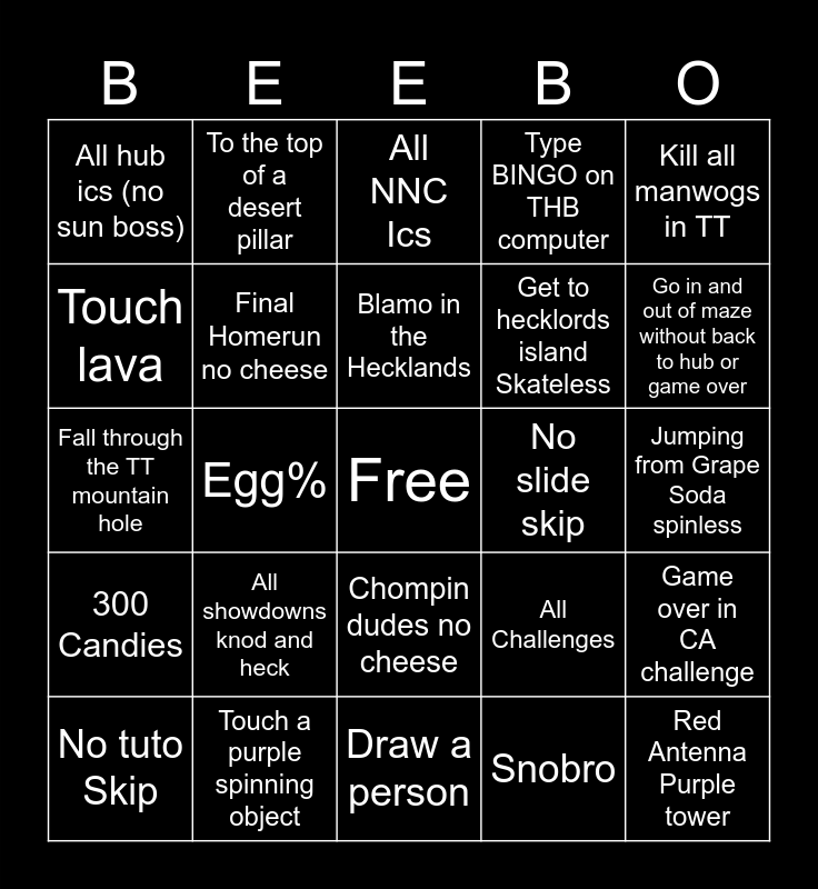 This bingo card has a free space and 39 words: TT fireflies JPless, NNC race JPless, TT race JPless, Final Homerun no cheese, No tuto Skip, Chompin dudes no cheese, Blamo in the Hecklands, Moai island, Kill all manwogs in TT, 300 Candies, Egg%, Type BINGO on THB computer, Red Antenna Purple tower, Jumping from Grape Soda spinless, No slide skip, All showdowns knod and heck, Touch scoobis (test zone), All hub ics (no sun boss), Knoddy in the black hole, All Challenges, Touch lava, Draw a person, Get to hecklords island Skateless, Go in and out of maze without back to hub or game over, Actually respond to Home work (one green one red), Get a score of 60000 with Skate, Change outfit, Get Across Spinning platforms without touching grass blocks, Chocolate ic (not in the play area), To the top of a desert pillar, Refrence dialog, Floating with flowers Jumpless, All NNC Ics, Touch a purple spinning object, Snobro, Climb a pole, Game over in CA challenge, Fall through the TT mountain hole and Fly under TT.