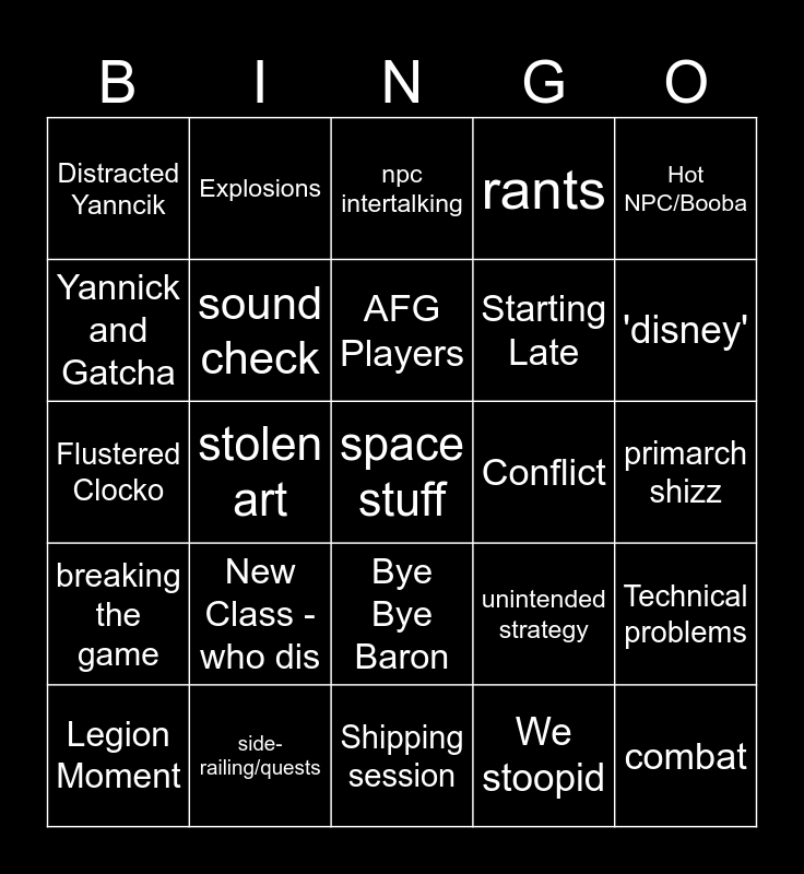 This bingo card has 25 words: New Class - who dis, Shipping session, AFG Players, Legion Moment, Hot NPC/Booba, Distracted Yanncik, Yannick and Gatcha, Explosions, Conflict, Bye Bye Baron, Starting Late, Flustered Clocko, unintended strategy, Technical problems, sound check, combat, primarch shizz, npc intertalking, 'disney', stolen art, space stuff, side-railing/quests, breaking the game, rants and We stoopid.