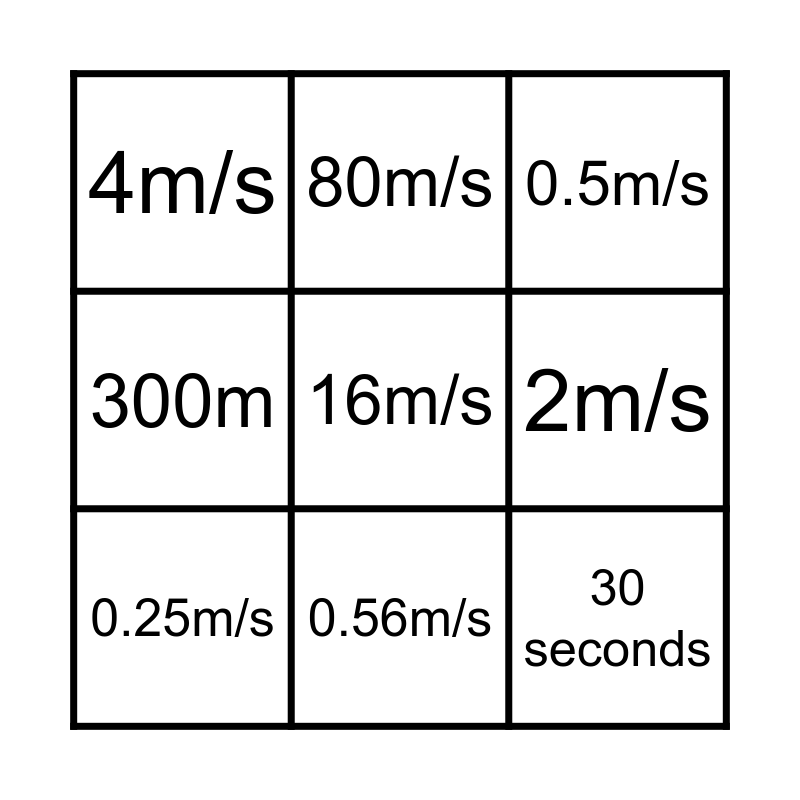 This bingo card has a free space and 8 words: 2m/s, 0.5m/s, 80m/s, 0.25m/s, 4m/s, 30 seconds, 300m and 0.56m/s.