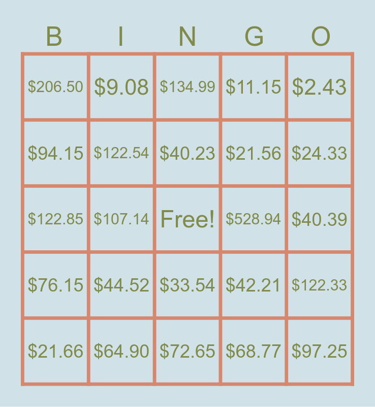 This bingo card has a free space and 24 words: $44.52, $64.90, $40.23, $21.66, $2.43, $206.50, $94.15, $9.08, $528.94, $33.54, $21.56, $122.85, $42.21, $122.33, $122.54, $68.77, $40.39, $134.99, $24.33, $107.14, $97.25, $76.15, $11.15 and $72.65.