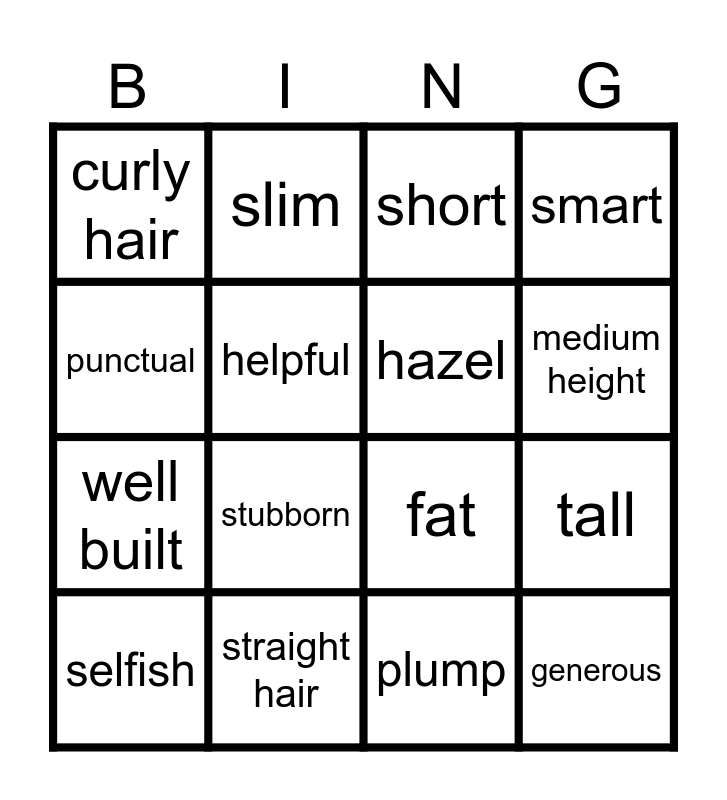 This bingo card has 16 words: straight hair, tall, short, curly hair, well built, slim, fat, plump, punctual, helpful, selfish, smart, stubborn, medium height, hazel and generous.