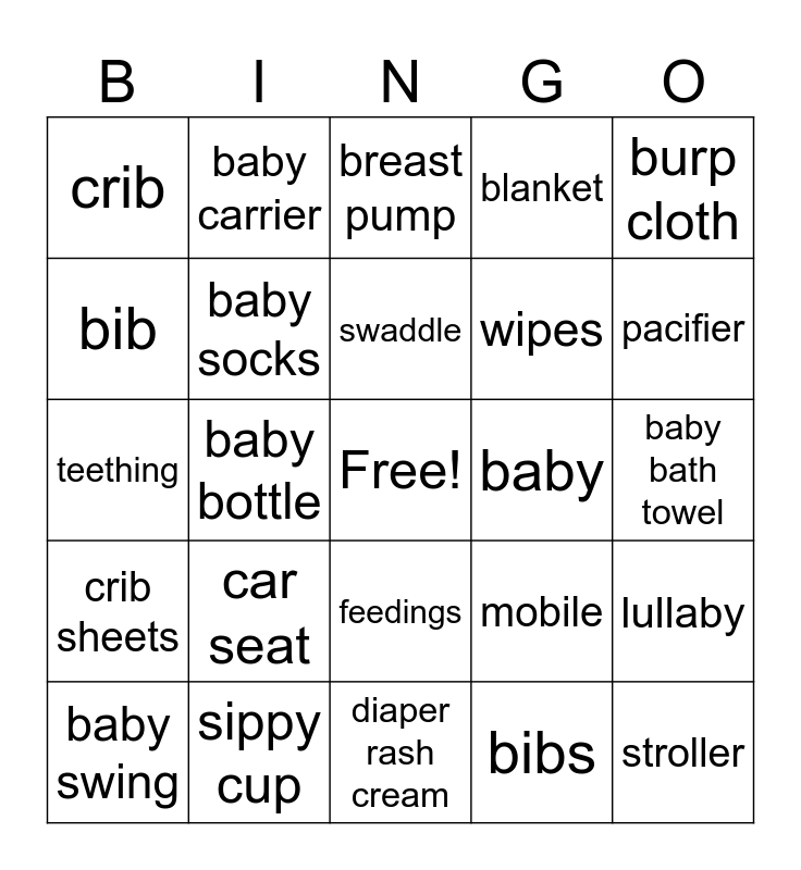 This bingo card has a free space and 29 words: baby swing, onesies, baby bottle, baby shower, crib, breast pump, baby socks, car seat, baby, sippy cup, baby bath towel, stroller, diaper rash cream, bibs, pacifier, high chair, feedings, crib sheets, burp cloth, teething, mobile, diaper, wipes, bib, blanket, baby carrier, lullaby, swaddle and baby food.
