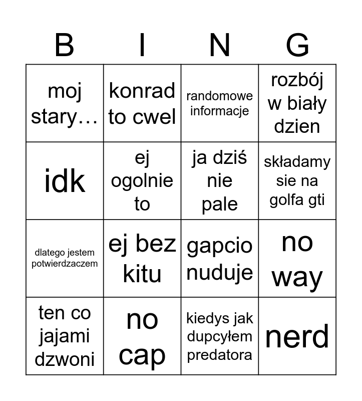 This bingo card has 16 words: no cap, no way, randomowe informacje, moj stary…, dlatego jestem potwierdzaczem, konrad to cwel, gapcio nuduje, kiedys jak dupcyłem predatora, idk, ej ogolnie to, ten co jajami dzwoni, rozbój w biały dzien, ej bez kitu, składamy sie na golfa gti, ja dziś nie pale and nerd.