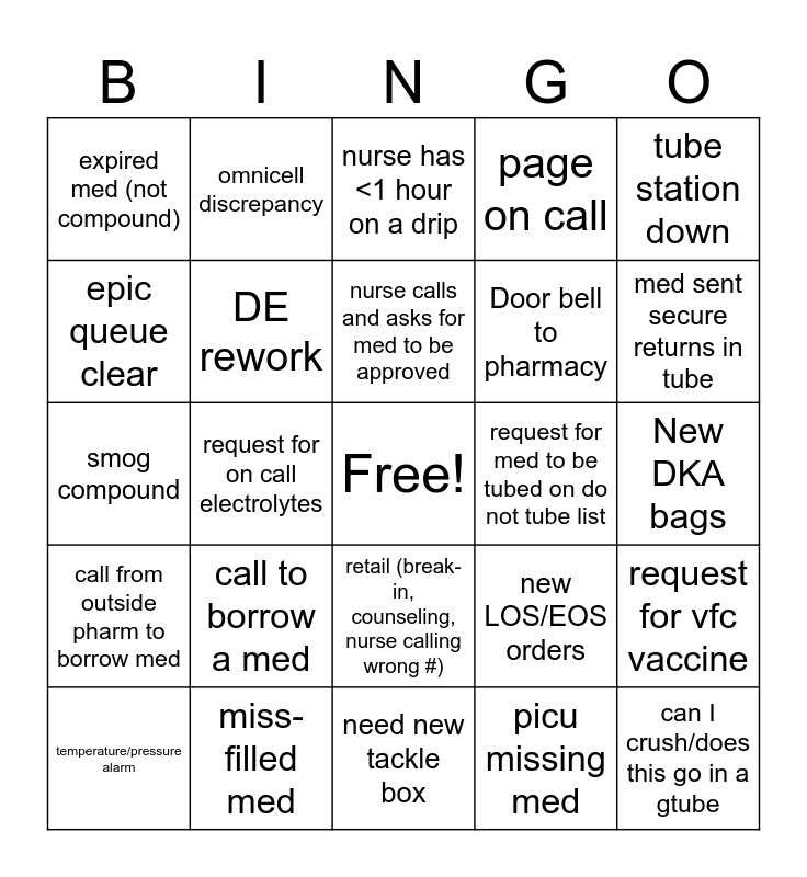 This bingo card has a free space and 45 words: compatibility question, can I crush/does this go in a gtube, stat alteplase, temperature/pressure alarm, code response needed, picu missing med, nurse has <1 hour on a drip, med request for order put in <10 min ago, tube station down, miss-filled med, page on call, request for med to be tubed on do not tube list, retail (break-in, counseling, nurse calling wrong #), call to borrow a med, med message requesting drug in omnicell, need new tackle box, expired compound, smog compound, premix station with >5 to prep, med sent secure returns in tube, omnicell discrepancy, med not scanning (doseedge or nurse call), trauma B/stab code/OB c-section, expired med (not compound), call from OR, New DKA bags, pharm-is ticket, doseedge bypass, new LOS/EOS orders, call from outside pharm to borrow med, tube shut down for full tube, request for vfc vaccine, recon antibiotic, ID home med, status board clear, request for on call electrolytes, omnicell issue, med message requesting med scanned into med bin, phone call from MD needing dose recommendation, nurse calls and asks for med to be approved, epic queue clear, Door bell to pharmacy, IV room calls out for stock, DE rework and need to waste for a narc.