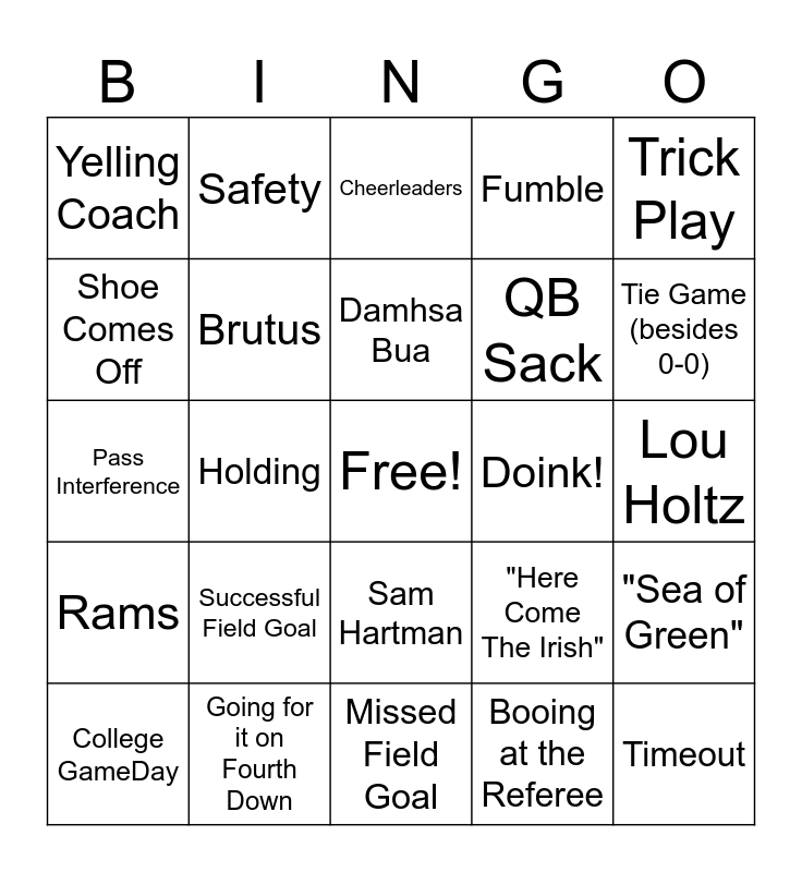 This bingo card has a free space and 52 words: Penalty Flag, Timeout, Touchdown Irish!, Missed Field Goal, Successful Field Goal, Two-Point Conversion Attempt, Safety, Pylon Knocked Over, Shoe Comes Off, Leprechaun, Brutus, Noah Eagle, "Sea of Green", "Here Come The Irish", Down Marker Knocked Over, Victory March, Damhsa Bua, Doink!, Punt, Trick Play, Holding, Booing at the Referee, Yelling Coach, QB Sack, Helmet Comes Off, Interception, High Five!, Shirtless Fan, Tie Game (besides 0-0), Fair Catch, Touchback, Fumble, Golden Dome, Touchdown Jesus, Cool Light Show, Cheerleaders, Going for it on Fourth Down, 1988, Taylor Swift, Lee Corso, Knute Rockne, Lou Holtz, Rams, Audric Estime, Sam Hartman, Grotto, Trojan Horse, Pass Interference, Marcus Freeman, Ryan Day, College GameDay and Playoffs.