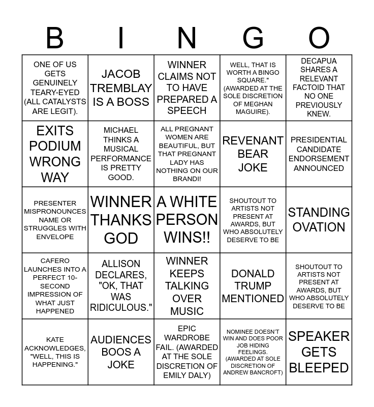 This bingo card has a free space and 24 words: ALLISON DECLARES, "OK, THAT WAS RIDICULOUS.", AUDIENCES BOOS A JOKE, ALL PREGNANT WOMEN ARE BEAUTIFUL, BUT THAT PREGNANT LADY HAS NOTHING ON OUR BRANDI!, KATE ACKNOWLEDGES, "WELL, THIS IS HAPPENING.", DECAPUA SHARES A RELEVANT FACTOID THAT NO ONE PREVIOUSLY KNEW., ONE OF US GETS GENUINELY TEARY-EYED (ALL CATALYSTS ARE LEGIT)., EXITS PODIUM WRONG WAY, JACOB TREMBLAY IS A BOSS, SHOUTOUT TO ARTISTS NOT PRESENT AT AWARDS, BUT WHO ABSOLUTELY DESERVE TO BE, WINNER KEEPS TALKING OVER MUSIC, REVENANT BEAR JOKE, PRESENTER MISPRONOUNCES NAME OR STRUGGLES WITH ENVELOPE, DONALD TRUMP MENTIONED, SHOUTOUT TO ARTISTS NOT PRESENT AT AWARDS, BUT WHO ABSOLUTELY DESERVE TO BE, MICHAEL THINKS A MUSICAL PERFORMANCE IS PRETTY GOOD., NOMINEE DOESN’T WIN AND DOES POOR JOB HIDING FEELINGS. (AWARDED AT SOLE DISCRETION OF ANDREW BANCROFT), STANDING OVATION, WINNER CLAIMS NOT TO HAVE PREPARED A SPEECH, PRESIDENTIAL CANDIDATE ENDORSEMENT ANNOUNCED, WINNER THANKS GOD, SPEAKER GETS BLEEPED, CAFERO LAUNCHES INTO A PERFECT 10-SECOND IMPRESSION OF WHAT JUST HAPPENED, WELL, THAT IS WORTH A BINGO SQUARE." (AWARDED AT THE SOLE DISCRETION OF MEGHAN MAGUIRE). and EPIC WARDROBE FAIL. (AWARDED AT THE SOLE DISCRETION OF EMILY DALY).