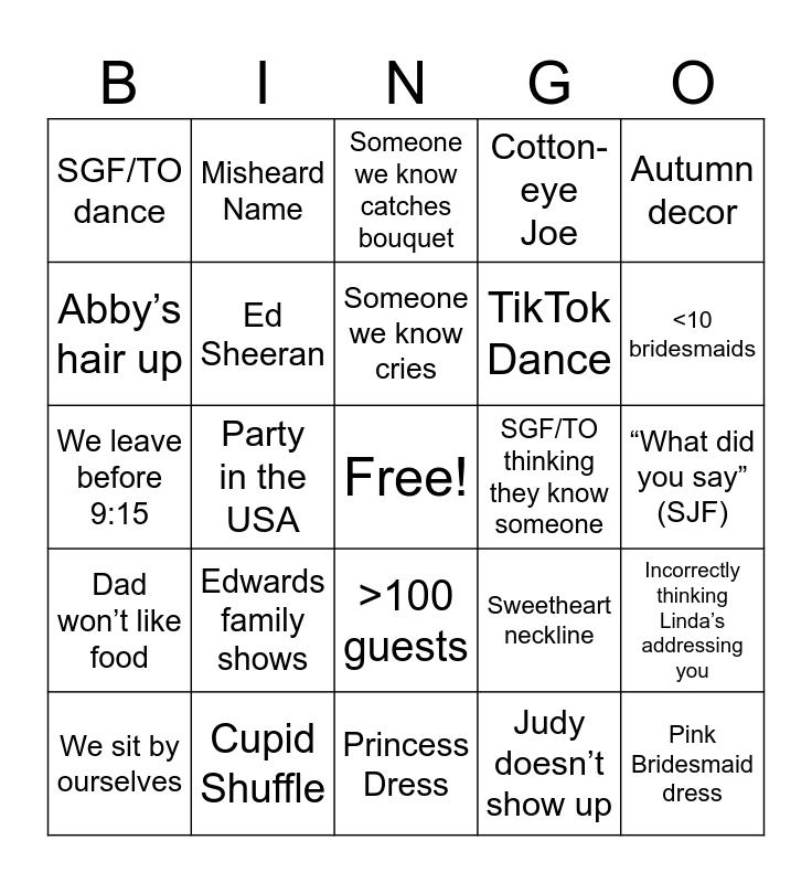 This bingo card has a free space and 24 words: Edwards family shows, Cupid Shuffle, Someone we know cries, We sit by ourselves, Autumn decor, SGF/TO dance, Abby’s hair up, Misheard Name, SGF/TO thinking they know someone, >100 guests, TikTok Dance, We leave before 9:15, Sweetheart neckline, Incorrectly thinking Linda’s addressing you, Ed Sheeran, Judy doesn’t show up, “What did you say” (SJF), Someone we know catches bouquet, <10 bridesmaids, Party in the USA, Pink Bridesmaid dress, Dad won’t like food, Cotton-eye Joe and Princess Dress.