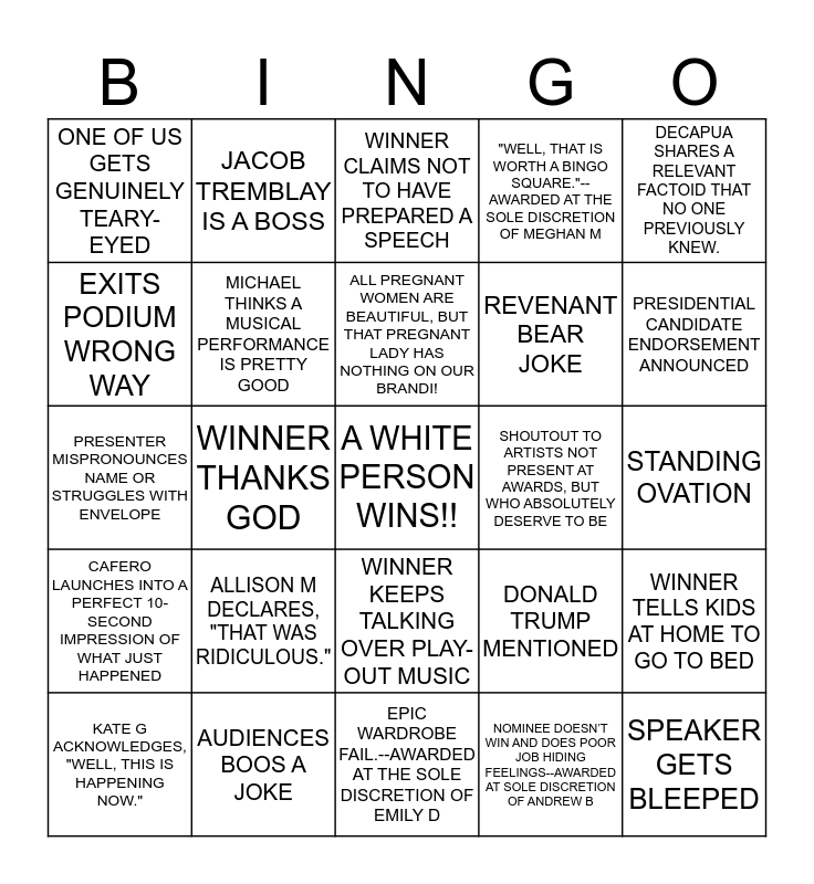 This bingo card has a free space and 24 words: ALLISON M DECLARES, "THAT WAS RIDICULOUS.", AUDIENCES BOOS A JOKE, ALL PREGNANT WOMEN ARE BEAUTIFUL, BUT THAT PREGNANT LADY HAS NOTHING ON OUR BRANDI!, KATE G ACKNOWLEDGES, "WELL, THIS IS HAPPENING NOW.", DECAPUA SHARES A RELEVANT FACTOID THAT NO ONE PREVIOUSLY KNEW., ONE OF US GETS GENUINELY TEARY-EYED, EXITS PODIUM WRONG WAY, JACOB TREMBLAY IS A BOSS, SHOUTOUT TO ARTISTS NOT PRESENT AT AWARDS, BUT WHO ABSOLUTELY DESERVE TO BE, WINNER KEEPS TALKING OVER PLAY-OUT MUSIC, REVENANT BEAR JOKE, PRESENTER MISPRONOUNCES NAME OR STRUGGLES WITH ENVELOPE, DONALD TRUMP MENTIONED, WINNER TELLS KIDS AT HOME TO GO TO BED, MICHAEL THINKS A MUSICAL PERFORMANCE IS PRETTY GOOD, NOMINEE DOESN’T WIN AND DOES POOR JOB HIDING FEELINGS--AWARDED AT SOLE DISCRETION OF ANDREW B, STANDING OVATION, WINNER CLAIMS NOT TO HAVE PREPARED A SPEECH, PRESIDENTIAL CANDIDATE ENDORSEMENT ANNOUNCED, WINNER THANKS GOD, SPEAKER GETS BLEEPED, CAFERO LAUNCHES INTO A PERFECT 10-SECOND IMPRESSION OF WHAT JUST HAPPENED, "WELL, THAT IS WORTH A BINGO SQUARE."--AWARDED AT THE SOLE DISCRETION OF MEGHAN M and EPIC WARDROBE FAIL.--AWARDED AT THE SOLE DISCRETION OF EMILY D.