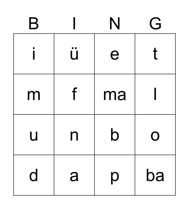 This bingo card has 16 words: a, o, e, i, u, ü, b, p, m, f, d, t, n, l, ma and ba.