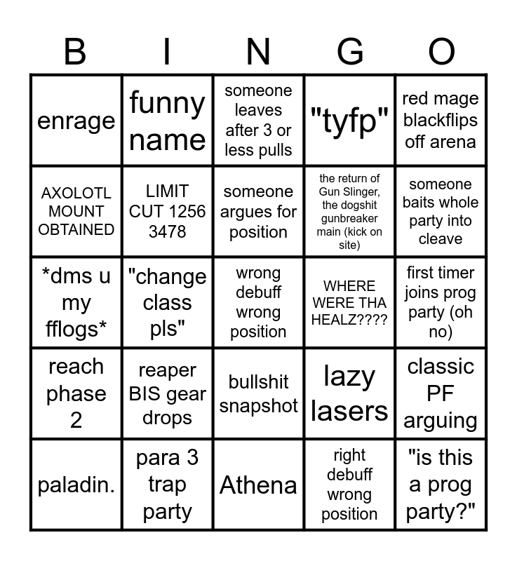 This bingo card has 25 words: reach phase 2, para 3 trap party, wrong debuff wrong position, right debuff wrong position, red mage blackflips off arena, enrage, funny name, someone leaves after 3 or less pulls, WHERE WERE THA HEALZ????, classic PF arguing, AXOLOTL MOUNT OBTAINED, LIMIT CUT 1256 3478, Athena, lazy lasers, someone baits whole party into cleave, paladin., "change class pls", someone argues for position, the return of Gun Slinger, the dogshit gunbreaker main (kick on site), first timer joins prog party (oh no), *dms u my fflogs*, reaper BIS gear drops, bullshit snapshot, "tyfp" and "is this a prog party?".