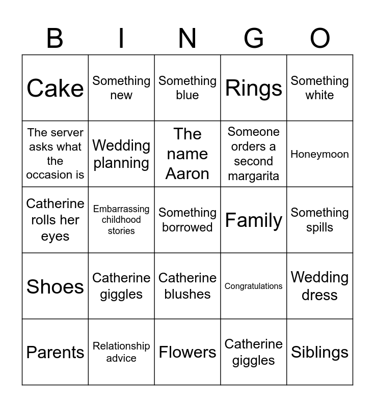 This bingo card has 25 words: Catherine giggles, Flowers, The name Aaron, Parents, Something white, Cake, The server asks what the occasion is, Something new, Family, Catherine blushes, Someone orders a second margarita, Catherine rolls her eyes, Congratulations, Wedding dress, Wedding planning, Siblings, Something spills, Something blue, Honeymoon, Embarrassing childhood stories, Something borrowed, Relationship advice, Shoes, Rings and Catherine giggles.