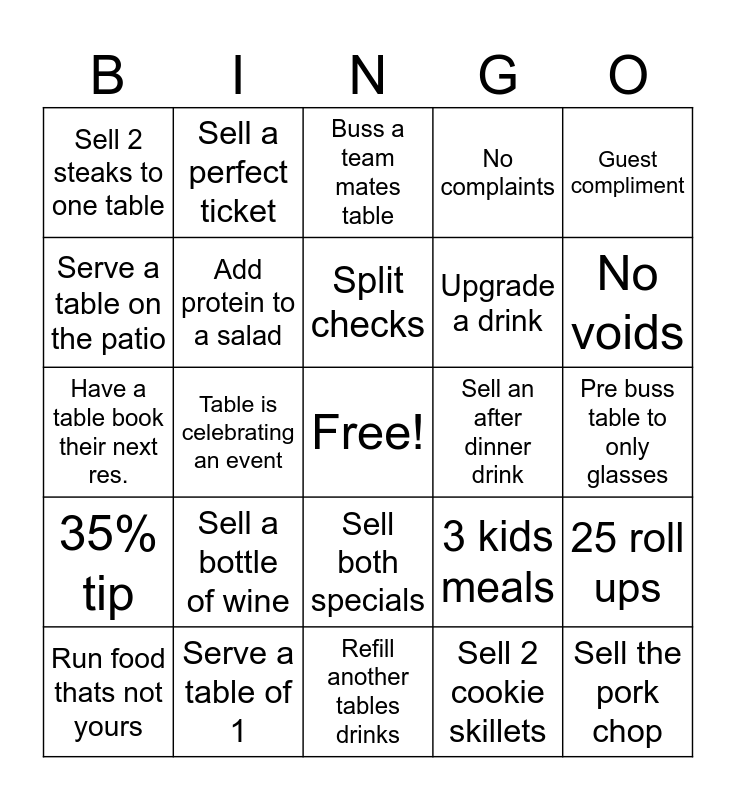 This bingo card has a free space and 24 words: Sell a bottle of wine, Serve a table of 1, Split checks, Run food thats not yours, Guest compliment, Sell 2 steaks to one table, Serve a table on the patio, Sell a perfect ticket, Sell an after dinner drink, Sell both specials, Upgrade a drink, Have a table book their next res., 3 kids meals, 25 roll ups, Add protein to a salad, Sell 2 cookie skillets, Pre buss table to only glasses, Buss a team mates table, No voids, Table is celebrating an event, Sell the pork chop, 35% tip, No complaints and Refill another tables drinks.
