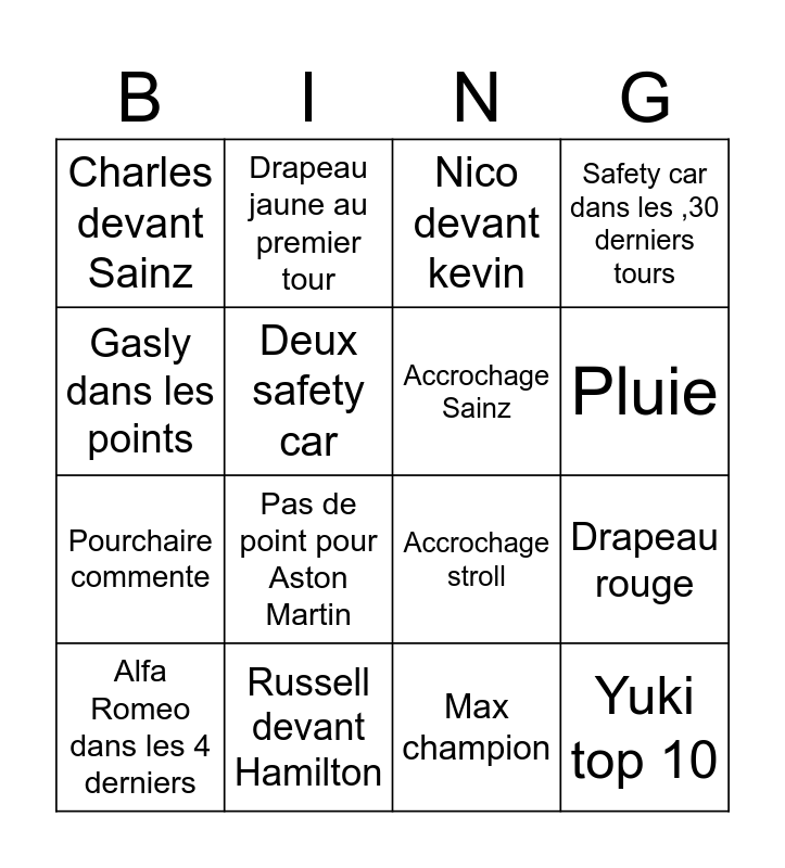 This bingo card has 23 words: Yuki top 10, Perez dans les points, Pluie, Unsafe release, Gasly dans les points, Charles devant Sainz, Deux safety car, Drapeau jaune au premier tour, Alfa Romeo dans les 4 derniers, Au moins 3 DNF, Pas de point pour Aston Martin, Pourchaire commente, Albon dans les points, Ferrari erreur stands, Russell devant Hamilton, McLaren marque plus de points sur Mercedes et Ferrari, Nico devant kevin, Accrochage stroll, Accrochage Sainz, Drapeau rouge, Safety car dans les ,30 derniers tours, Max champion and Trois écuries différentes sur le podium.