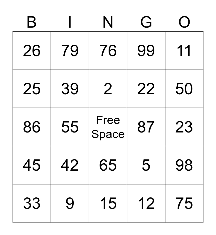 This bingo card has a free space and 24 words: 42, 9, 2, 33, 11, 26, 25, 79, 87, 65, 22, 86, 5, 98, 39, 12, 23, 76, 50, 55, 75, 45, 99 and 15.