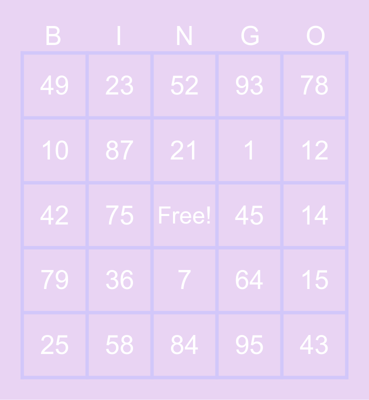 This bingo card has a free space and 24 words: 36, 58, 21, 25, 78, 49, 10, 23, 45, 7, 1, 42, 64, 15, 87, 95, 14, 52, 12, 75, 43, 79, 93 and 84.