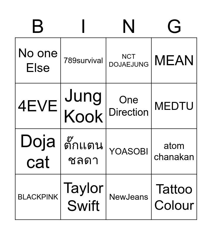 This bingo card has 26 words: Free!, billkin, MEDTU, AKMU, 4EVE, No one Else, Jung Kook, 789survival, NewJeans, fellow fellow, Doja cat, YOASOBI, FIFTY FIFTY, safeplanet, atom chanakan, Slot Machine, MEAN, Tattoo Colour, NCT DOJAEJUNG, BLACKPINK, ตั๊กแตน ชลดา, เอกชัย ศรีวิชัย, Taylor Swift, Ariana Grande, One Direction and ต่าย อรทัย.