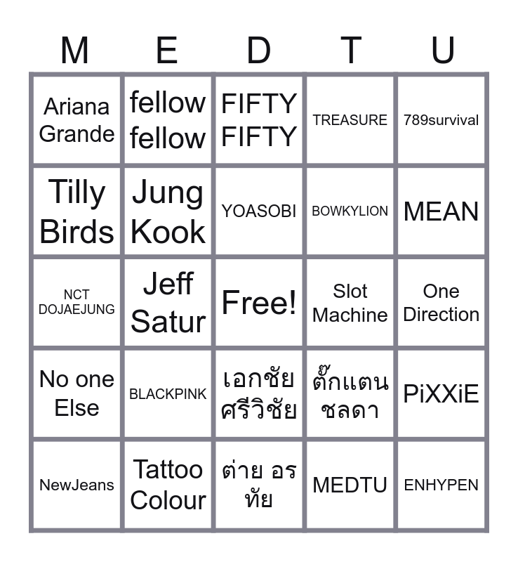 This bingo card has a free space and 34 words: billkin, MEDTU, AKMU, 4EVE, No one Else, Jung Kook, 789survival, NewJeans, fellow fellow, Doja cat, YOASOBI, FIFTY FIFTY, safeplanet, atom chanakan, Slot Machine, MEAN, Tattoo Colour, NCT DOJAEJUNG, BLACKPINK, ตั๊กแตน ชลดา, เอกชัย ศรีวิชัย, Taylor Swift, Ariana Grande, One Direction, ต่าย อรทัย, ENHYPEN, TREASURE, PP Krit, BOWKYLION, Tilly Birds, Dept, Jeff Satur, PiXXiE and Justin Bieber.