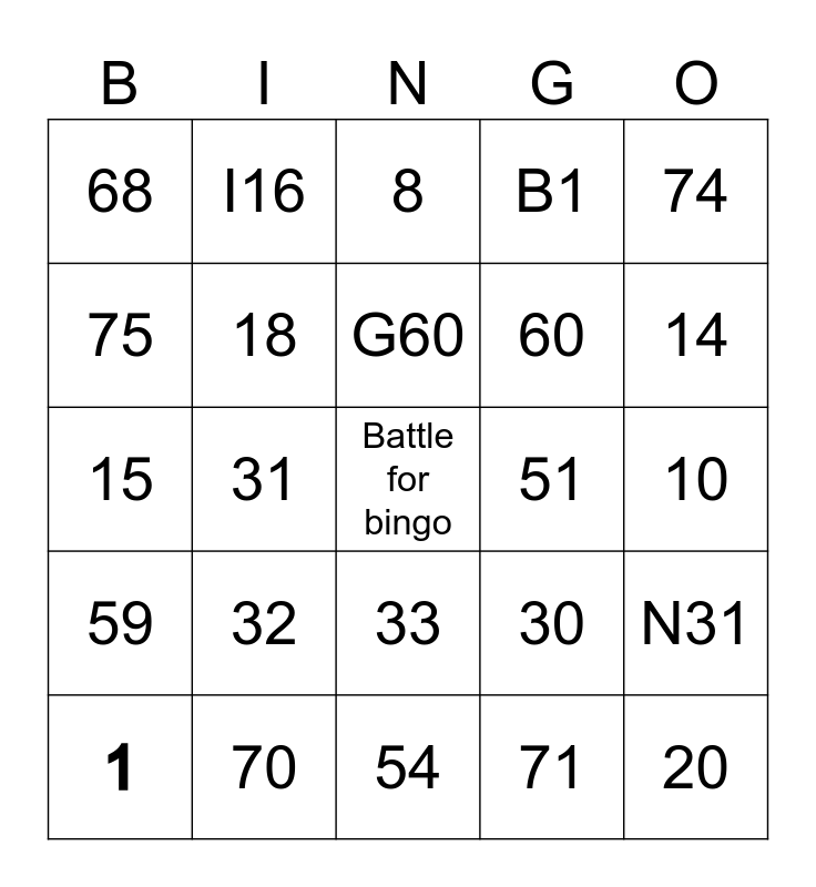 This bingo card has a free space and 29 words: 1, 16, 31, 47, 68, 8, 18, 32, 51, 70, 10, 20, 54, 71, 14, 29, 33, 59, 74, 15, 30, 35, 60, 75, B1, I16, N31, G60 and O75.