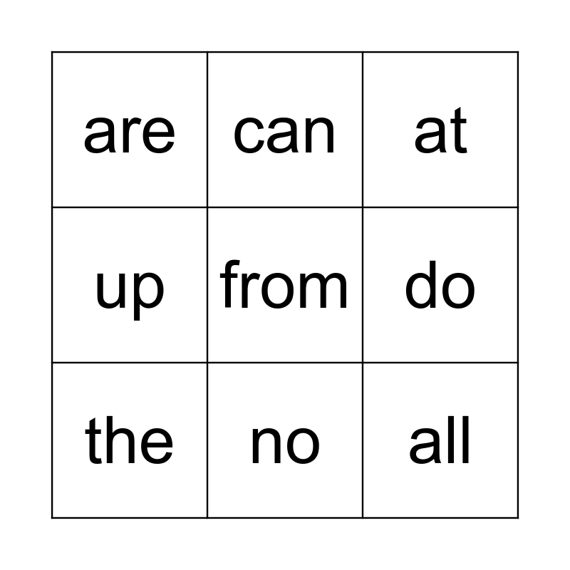 This bingo card has 9 words: the, at, can, up, are, do, from, all and no.