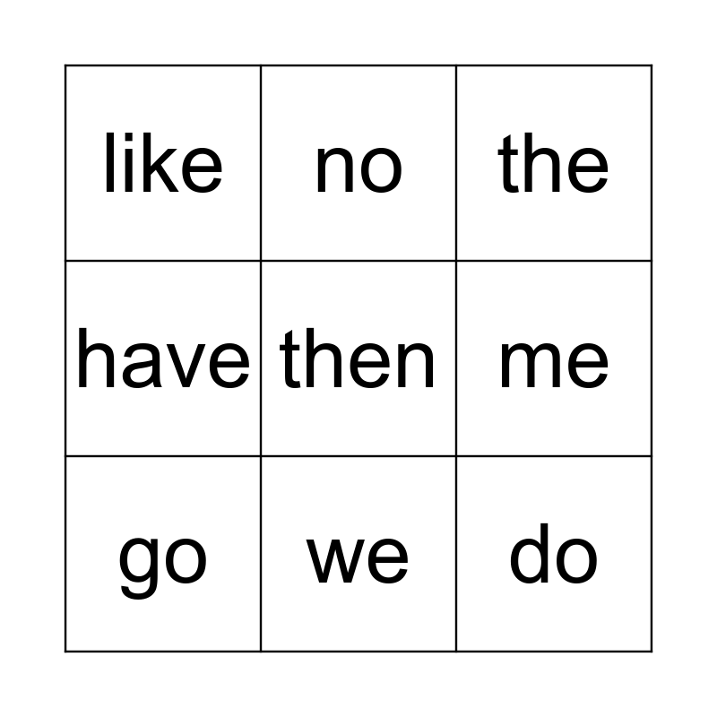 This bingo card has 9 words: go, the, no, have, like, me, then, do and we.