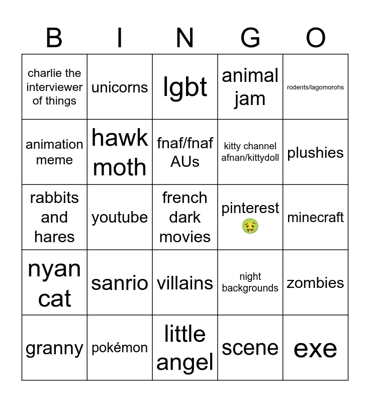 This bingo card has 35 words: creepypasta, suicideshop, miraculous ladybug, hawk moth, villains, animal jam, animation meme, piggy, fnaf/fnaf AUs, senpai/uwu unironically, rabbits and hares, rodents/lagomorohs, the three little pigs, discovery kids, charlie the interviewer of things, pinterest 🤢, scene, youtube, nyan cat, french dark movies, night backgrounds, granny, zombies, pokémon, lgbt, plushies, exe, grumpy, kitty channel afnan/kittydoll, minecraft, strikeforce kitty, little angel, sanrio, unicorns and beat bugs.