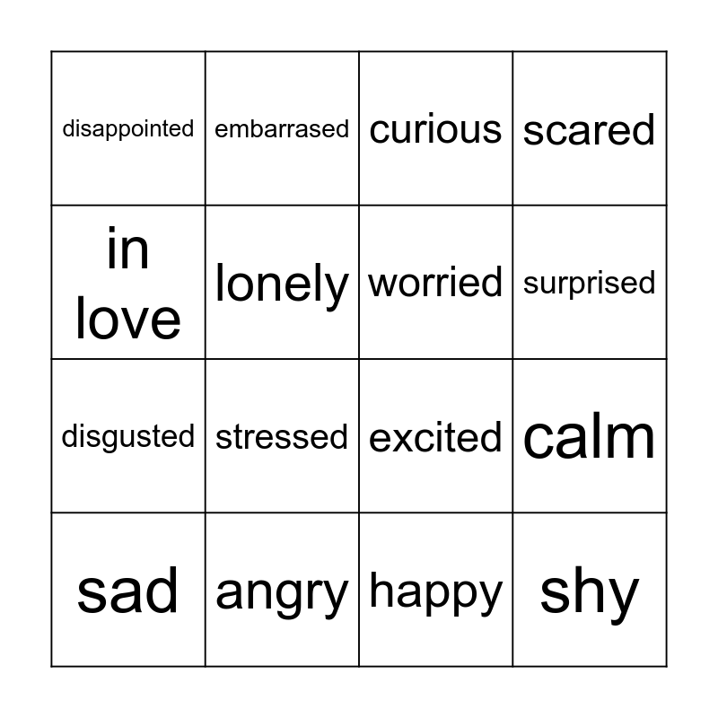 This bingo card has 16 words: angry, calm, curious, disappointed, disgusted, embarrased, excited, happy, in love, lonely, sad, scared, stressed, surprised, worried and shy.