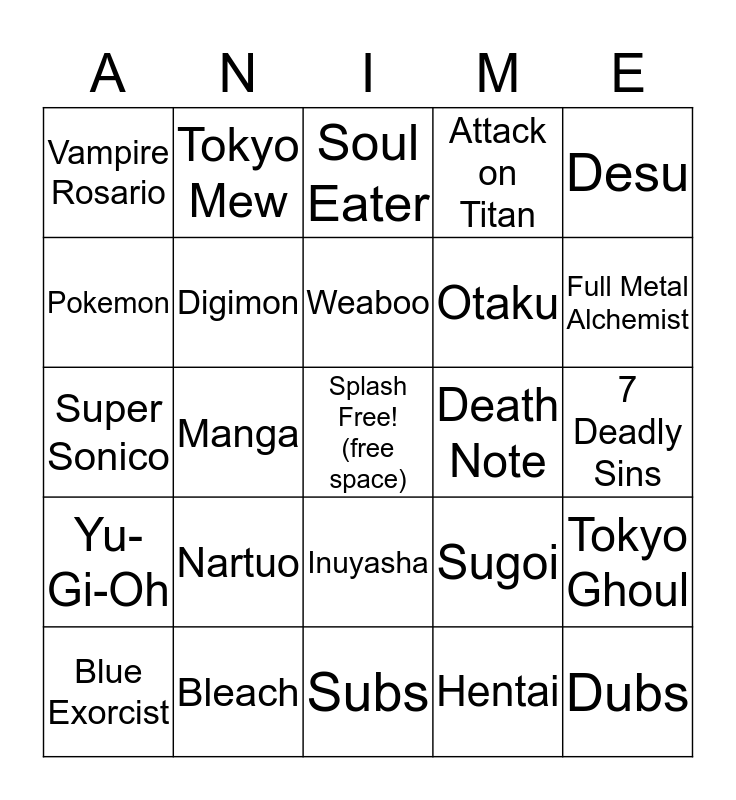 This bingo card has a free space and 24 words: Nartuo, Bleach, Weaboo, Blue Exorcist, Desu, Vampire Rosario, Pokemon, Tokyo Mew, Death Note, Inuyasha, Otaku, Super Sonico, Sugoi, Tokyo Ghoul, Digimon, Hentai, 7 Deadly Sins, Soul Eater, Full Metal Alchemist, Manga, Dubs, Yu-Gi-Oh, Attack on Titan and Subs.
