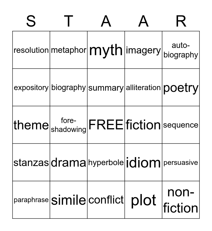 This bingo card has a free space and 24 words: drama, simile, summary, paraphrase, auto- biography, resolution, expository, metaphor, fiction, hyperbole, alliteration, theme, idiom, persuasive, biography, plot, sequence, myth, poetry, fore-shadowing, non-fiction, stanzas, imagery and conflict.