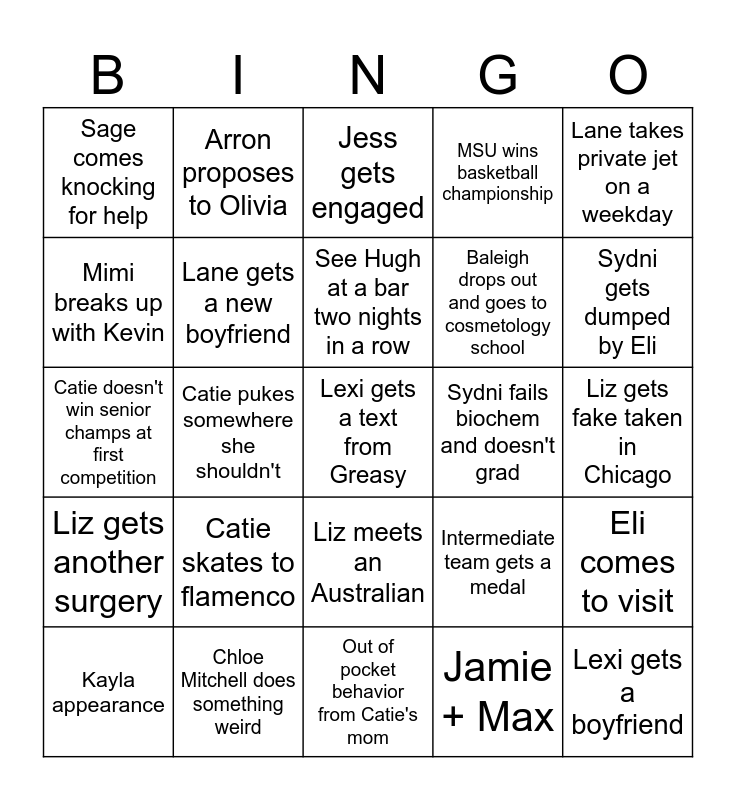 This bingo card has a free space and 24 words: Catie skates to flamenco, Chloe Mitchell does something weird, See Hugh at a bar two nights in a row, Kayla appearance, Lane takes private jet on a weekday, Sage comes knocking for help, Mimi breaks up with Kevin, Arron proposes to Olivia, Sydni fails biochem and doesn't grad, Liz meets an Australian, Baleigh drops out and goes to cosmetology school, Catie doesn't win senior champs at first competition, Intermediate team gets a medal, Eli comes to visit, Lane gets a new boyfriend, Jamie + Max, Liz gets fake taken in Chicago, Jess gets engaged, Sydni gets dumped by Eli, Catie pukes somewhere she shouldn't, Lexi gets a boyfriend, Liz gets another surgery, MSU wins basketball championship and Out of pocket behavior from Catie's mom.