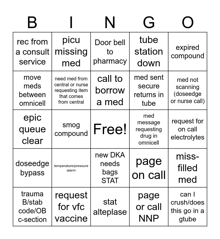 This bingo card has a free space and 49 words: compatibility question, can I crush/does this go in a gtube, TPN issue, stat alteplase, temperature/pressure alarm, code response needed, picu missing med, nurse has <1 hour on a drip, move meds between omnicell, med request for order put in <10 min ago, need med from central or nurse requesting item that comes from central, tube station down, miss-filled med, page on call, request for med to be tubed on do not tube list, retail (break-in, counseling, nurse calling wrong #), call to borrow a med, med message requesting drug in omnicell, need new tackle box, expired compound, smog compound, page or call NNP, rec from a consult service, med sent secure returns in tube, omnicell discrepancy, med not scanning (doseedge or nurse call), trauma B/stab code/OB c-section, expired med (not compound), new DKA needs bags STAT, doseedge bypass, brand new TPN, new LOS/EOS orders, call from outside pharm to borrow med, tube shut down for full tube, request for vfc vaccine, recon antibiotic, ID home med, status board clear, request for on call electrolytes, omnicell issue, rabies vaccine, phone call from MD needing dose recommendation, critical dose warning overridey, nurse calls and asks for med to be approved, epic queue clear, Door bell to pharmacy, IV room calls out for stock, DE rework and need to waste for a narc.