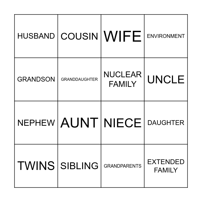 This bingo card has 16 words: SIBLING, DAUGHTER, WIFE, HUSBAND, NEPHEW, COUSIN, NIECE, GRANDPARENTS, GRANDSON, GRANDDAUGHTER, TWINS, ENVIRONMENT, AUNT, UNCLE, NUCLEAR FAMILY and EXTENDED FAMILY.