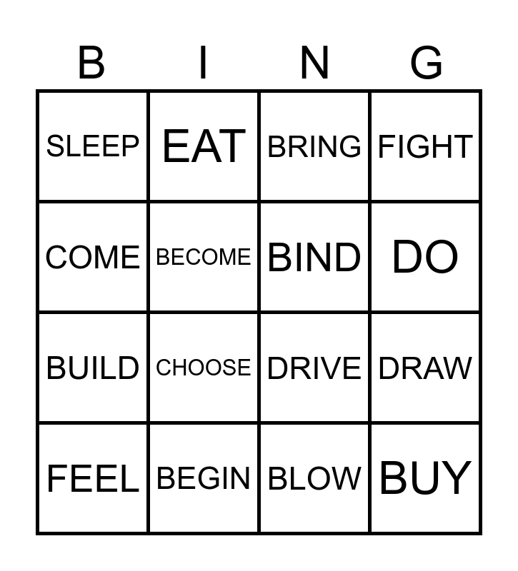 This bingo card has 27 words: BREAK, FALL, BUILD, BE, BECOME, BRING, EAT, BUY, BEGIN, DRINK, DRIVE, FIGHT, DEAL, CATCH, CHOOSE, BITE, BIND, DO, CUT, SLEEP, BLOW, BURN, DRAW, FEEL, GO, COME and DIG.