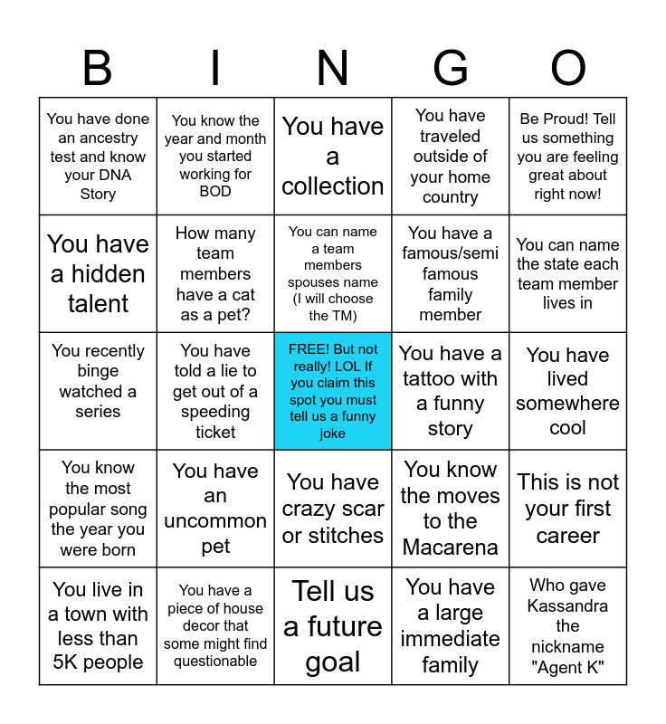 This bingo card has a free space and 24 words: You have an uncommon pet, You have a piece of house decor that some might find questionable, You can name a team members spouses name (I will choose the TM), You live in a town with less than 5K people, Be Proud! Tell us something you are feeling great about right now!, You have done an ancestry test and know your DNA Story, You have a hidden talent, You know the year and month you started working for BOD, You have a tattoo with a funny story, You have crazy scar or stitches, You have a famous/semi famous family member, You recently binge watched a series, You know the moves to the Macarena, This is not your first career, How many team members have a cat as a pet?, You have a large immediate family, You have lived somewhere cool, You have a collection, You can name the state each team member lives in, You have told a lie to get out of a speeding ticket, Who gave Kassandra the nickname "Agent K", You know the most popular song the year you were born, You have traveled outside of your home country and Tell us a future goal.