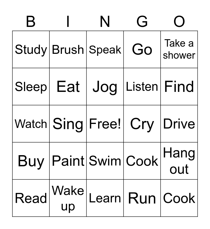 This bingo card has a free space and 26 words: Swim, Run, Jog, Wake up, Take a shower, Study, Sleep, Brush, Drive, Cook, Listen, Watch, Hang out, Read, Sing, Play, Go, Buy, Speak, Cook, Find, Learn, Cry, Paint, Eat and Call.